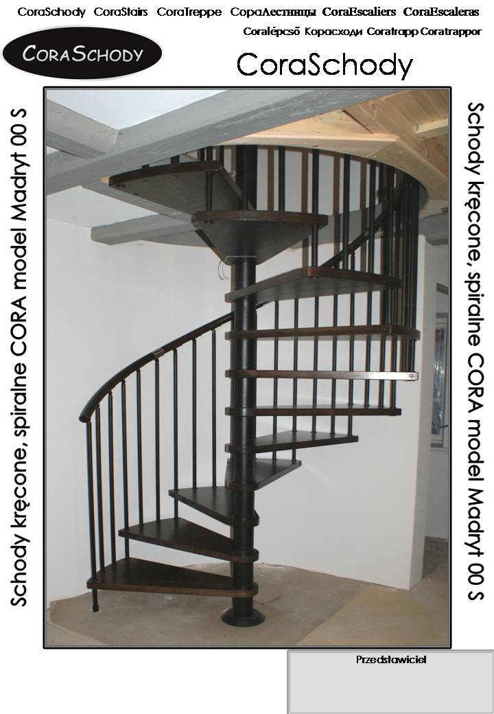 Polsk producent av spiral, slingrande och spiraltrappa CORA Tillgängliga storlekar av trappor är 110, 120, 130, 140, 150, 160, 170, 180, 190, 200 och mer Lastkapacitet: last per en 180 kg. Trappbehandling: vänsterhänt eller medurs från första steg
